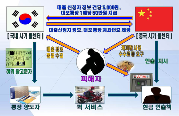 경찰에 따르면 이씨 등 주범 5명은 지난해 1월부터 12월까지 서울 A오피스텔 등 국내 6개 콜센터에서 금융기관을 사칭, 저금리 대출을 빙자해 대출희망자 1만5천명의 금융정보를 수집한 후, 이를 중국 보이스피싱 조직에 실시간 전송해 대출사기에 이용케 하고, 주류회사 등을 사칭, 통장 임대료를 지급하겠다고 속여 1500명으로부터 대포통장을 모집한 후, 이를 퀵서비스를 통해 중국 보이스피싱 조직 현금인출책들에게 직접 공급하는 수법으로 총 449회에 걸쳐 54억원 상당을 편취한 혐의를 받고 있다.