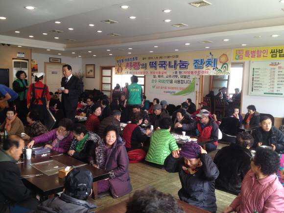목포시 하당동에 위치한 신도시떡방앗간(대표 서종일)과 원조이동갈비(대표 김석지)는 지난 15일 원조이동갈비에서 을미년 새해를 맞아 관내 65세 이상 어르신 400여명을 초청해 사랑의 떡국 나눔 행사를 개최했다.