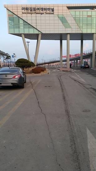 ▲현대백화점 주변도로 뿐아니라 아라김포여객터미널로 가는 도로에도 공사로 인한 도로 균열이 심하다