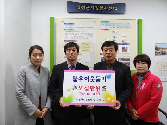 ▲▲ 대한지적공사 강원본부 정선지사(지사장 공석)는 어려운 이웃을 위하는 직원들의 마음을 모은 사랑의 성금으로 온누리 상품권 500,000원을 구매해 어려운 이웃들이 따뜻한 겨울나기를 바라는 마음으로 정선군 자원봉사센터에 지정기탁 했다. 한편 대한지적공사 정선군 지사는 4년째 꾸준히 사랑나눔 활동으로 행복하고 따뜻한 마음을 전달하고 있다.(사진제공=정선군청)