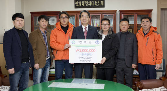 ▲▲ 영어조합법인 인제농수산은 26일 인제 군청을 방문해 지역인재 양성을 위해 써달라며 장학금 100만원을 기탁했다.(사진제공=인제군청)