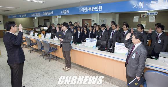▲▲ (CNB=최성락 기자) 27일 인제군 종합민원실 직원 일동은 새해, 새마음으로 민원인을 가족처럼 여기고 민원인들이 내 집처럼 편안하게 민원을 해결할 수 있도록 '정감 민원행정' 실천을 다짐했다.(사진제공=인제군청)