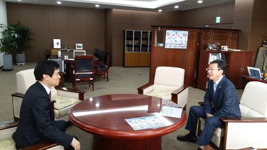 ▲홍철호 국회의원이 이성보 위원장을 만나 한강하구 철책제거에 적극 협조해 줄 것을 촉구하고 있다.