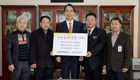 ▲▲ (CNB=최성락 기자) ㈜파마폰티스(영업본부장 곽의영) · ㈜비엔제이(대표이사 이창범)는 28일 인제군청을 방문해 어려운 이웃을 위해 써달라며 의약용품 1,400개(180만 원 상당), 음료 1,056개(260만 원 상당), 육포 1,000개(250만 원 상당)를 전달했다. (사진제공=인제군청)