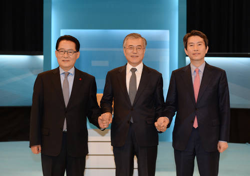 ▲새정치민주연합 당 대표 및 최고위원 후보들은 오는 2월8일 개최될 전당대회를 앞두고 31일 서울·인천을 시작으로 2월1일 경기 등 수도권 지역 대의원대회에 잇따라 참석해 합동연설에 나서는 등 마지막 수도권 표심공략에 나섰다. 지난주까지 지역을 돌며 연설 대결을 벌인 후보들은 수도권이라는 상징성과 함께 부동층이 다수여서 접전 지역으로 평가받는 수도권 지역 당원·대의원들을 상대로 지지를 호소했다. 당대표 후보로 나선 박지원(왼쪽 부터), 문재인, 이인영 후보가 29일 서울 SBS 목동방송센터에서 열린 지상파 방송 3사 주최 TV 토론회에서 포즈를 취하고 있다.(사진=연합뉴스)