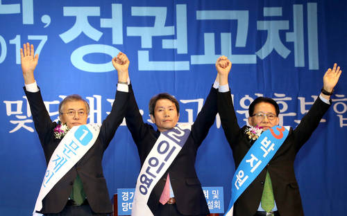 ▲새정치민주연합이 불과 1주일 뒤에 치러질 전당대회에서 당권 경쟁이 초박빙 판세 속에 후보간 경쟁이 격화하면서 부정 선거운동 의혹이나 일반당원ㆍ국민 여론조사 경선규칙을 둘러싼 갈등이 터져 나오는 등 막판 변수 출몰에 술렁이며 혼탁 양상으로 흐르고 있다.당 대표에 출마한 박지원(오른쪽부터)·이인영·문재인 당대표 후보가 1일 수원 아주대학교 체육관에서 열린 경기합동연설회에서 손을 들어 지지자들에게 답례하고 있다.(사진=연합뉴스)