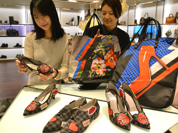 롯데백화점 MB1층 에비뉴엘관 힐앤토트 매장에서는 꽃무늬 등 화려한디자인의 핸드백과 구두를 선보여 눈길을 끌고 있다. 이 매장에서는 오는 15일까지 30% 할인행사를 진행중이다. (사진제공=롯데백화점 부산본점)