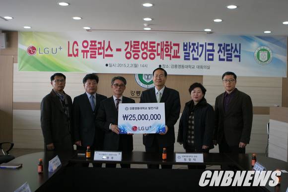 (CNB=최성락 기자) LG 유플러스 강원지사(지사장 김영후)는 2일 강릉영동대학교(총장 정창덕)에 발전기금 2,500만 원을 기탁했다. 이날 전달식에는 김영후 강원지사장, 권혁균 차장, 강릉영동대학교 정창덕 총장 및 학교 관계자 등이 참석한 가운데 진행됐다. 이 자리서 정창덕 총장은 "여러모로 어려운 상황에서 학교를 위한 발전기금을 전달해주셔서 진심으로 감사드린다. "며 "훌륭한 인재양성을 위해 지역과 국가발전에 기여 하겠다. "고 말했다. 강릉영동대학교는 오는 10~ 27일까지 정시모집을 진행한다.