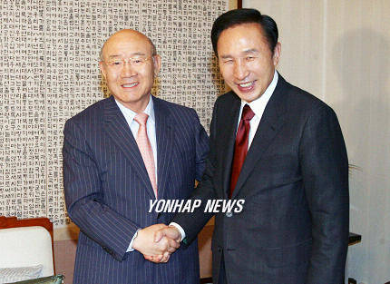 ▲지난 2007년 8월, 이명박 당시 한나라당 대선 후보가 전두환 전 대통령(왼쪽) 자택을 방문해 악수하고 있다. 이명박 전 대통령은 80년대초 신군부가 현대그룹에게 자동차사업을 포기할 것을 종용했다고 회고록에서 밝혔다. 전 전 대통령은 이에 대해 침묵으로 일관하고 있다. (사진=연합뉴스DB)