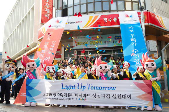광주U대회 조직위는 D-150일인 3일 오후 2시부터 충장로 광주우체국 앞에서 조직위 직원과 광주국제행사성공개최 시민협의회, 광주지방경찰청 등 100여명이 참석한 가운데 ‘광주U대회 성공다짐 실천대회’를 진행했다.