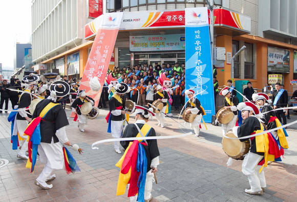 ▲광주U대회 개막을 150일 앞두고 3일 오후 충장로 광주우체국 앞에서 열린 ‘광주U대회 성공다짐 실천대회’에서 광주송원초등학교 학생들이 거리 퍼레이드에 앞서 사물놀이 공연으로 행사의 흥을 돋우고 있다.