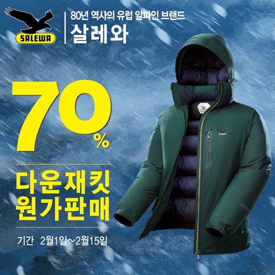 80년 역사의 유럽 알파인 브랜드 '살레와'는 공식 온라인 쇼핑몰 살레와존과 전국 대리점을 통해 다운재킷을 70% 할인하는 행사를 실시한다고 밝혔다.