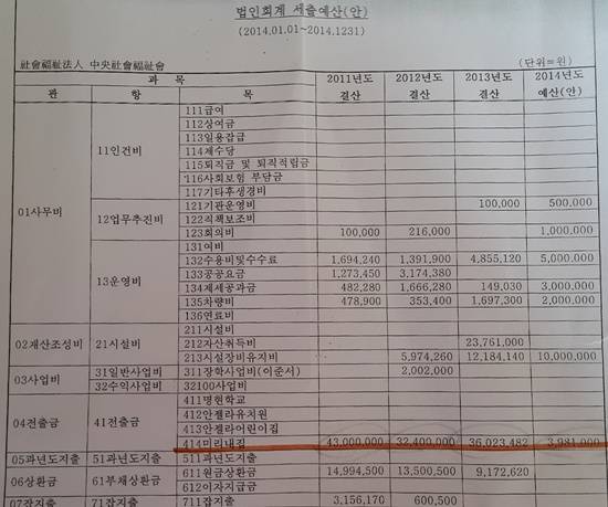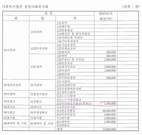 하지만 기자가 취재한 바에 의하면 이번 2015년 1월 세출예산안에도 150만원이 미리내집 전출금으로 잡혀 있어 통장을 과거 감사로부터 지적을 받은 후 없앴다는 말은 사실과 다름이 드러났다. 아직도 법인 통장으로 후원금을 받고 있었던 것.