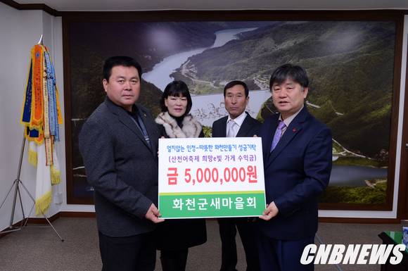 ▲▲ (CNB=최성락 기자) 6일 화천군새마을회(회장 김영수)는 지난 2015 얼음나라화천 산천어축제 기간 동안 매점운영 수익금 500만 원을 지역 내 어려운 이웃을 위해 써달라며 화천군에 기부해다. 이는 지난해 12월말 화천군 지역사회복지협의체(공동위원장 안귀환)와의 업무협약을 통해 이뤄졌으며 화천군새마을회는 지난해에 이어 두 번째로 산천어축제 수익금을 '얼지않는 인정-따뜻한 화천만들기'에 기부했다. (사진제공=화천군청)