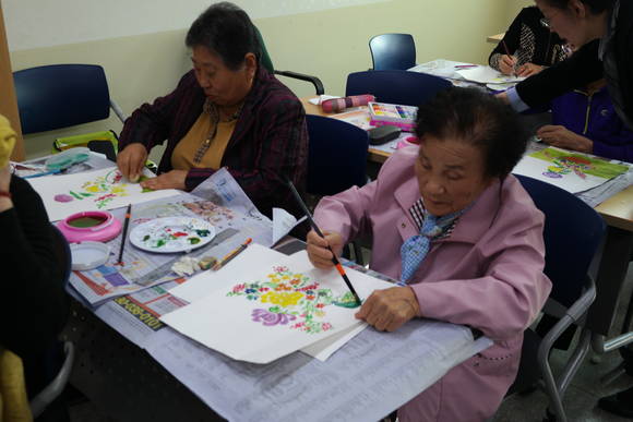 ▲목포공공도서관이 운영하는 훈민정음대학에서 어머니들이 미술수업을 받고 있다.