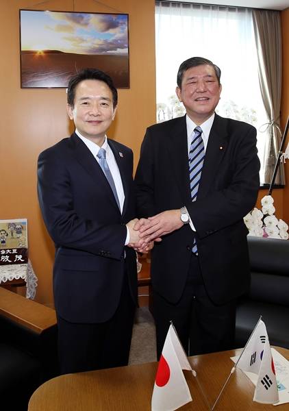 일본 현지시각 9일 오후 일본 합동청사에서 남경필 경기도지사가 이시바 시게루 특명 담당대신과 면담을 하고 기념촬영을 하고 있다.