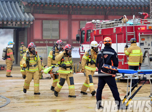 이날 경복궁 재난대응 훈련에 서울시소방재난본부 소방관들이 함께하고 있다.(사진=문화재청)