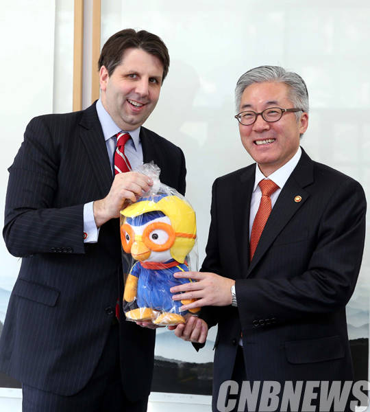 김종덕 문화체육관광부 장관이 11일 서울 종로구 국립현대미술관 서울관 접견실에서 마크 리퍼트 주한미국대사에게 우리나라 캐릭터 인형인 뽀로로를 선물하고 기념 촬영도 함께 하고 있다.(사진=문화체육관광부)