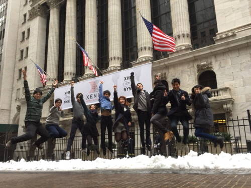▲행사에 참석한 10명의 수상자들이 뉴욕증권거래소 앞에서 단체 기념촬영을 하고 있다. (사진제공=동부문화재단)