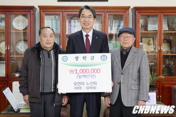 ▲▲ 인제군 남면 수산리 노인회(회장 심재영)는 12일 인제 군청을 방문해 재작년에 이어 폐품 등을 수집해 판매한 수익금으로 지역인재육성에 써달라며 장학금 100만 원을 기탁했다. (사진제공=인제군청)