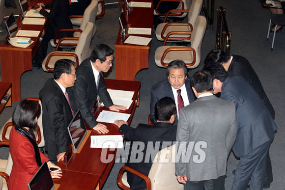 12일 오후 국회 본회의장에서 이완구 국무총리 후보자 임명동의안 본회의 상정 처리를 위해 새누리당 의원들이 김무성대표와 협의를 하고 있다.
