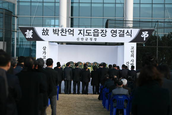 신안군에서는 지난 10일 지도~임자도간 연륙교 건설사업장을 점검하던중 누적된 과로로 호흡곤란 증세를 보이며 쓰러져 끝내는 목숨을 잃은 고 박찬억 지도읍장의 영결식을 신안군청장으로 신안군청 광장에서 거행했다.