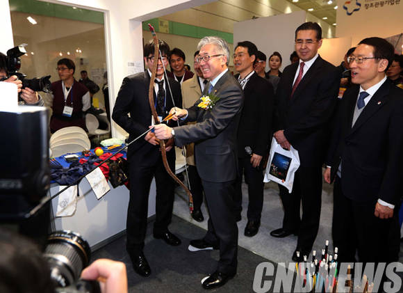 이날 참석한 김종덕 문화체육관광부 장관이 국궁을 시연해 보고 있다.(사진=문화체육관광부)