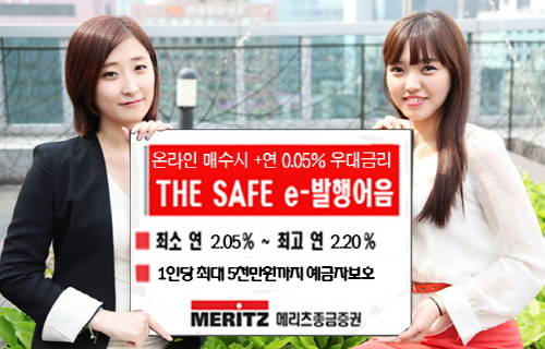 기존 메리츠 THE SAFE 발행어음 상품에 전 구간 0.05% 우대수익률을 추가해 1~29일 2.05%, 30~89일 2.05%, 90~179일 2.10%, 180~269일 2.15%, 270~364일 2.15%, 365일 2.20%의 수익률을 제공한다.