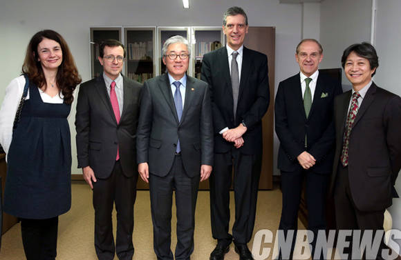 김종덕 문화체육관광부 장관(왼쪽 세 번째)이 어제 12일 서울 용산구 서계동 회의실에서 2월 11일∼2월 13일 국립현대미술관 서울관에서 열리고 있는 ‘2015-2016 한-불 상호교류의 해’(한-불 수교 130주년 기념행사) 제2차 공동회의에 참석하기 위해 한국을 방문중인 암리 루아레트(Henri Loyrette) 프랑스 측 조직위원장(왼쪽 네 번째) 등 프랑스 대표단 일행 및 관계자들과 기념촬영을 하고 있다.(사진=문화체육관광부)