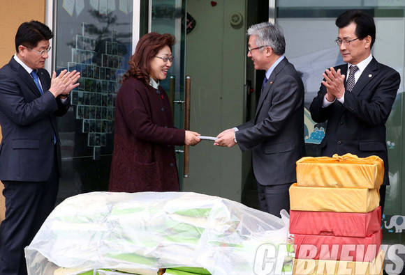 김종덕 문화체육관광부 장관이 16일 설을 맞아, 충북 청주시에 위치한 한 사회복지시설을 방문해 권현숙 원장에게 위문품을 전달하고 있다.(사진=문화체육관광부)