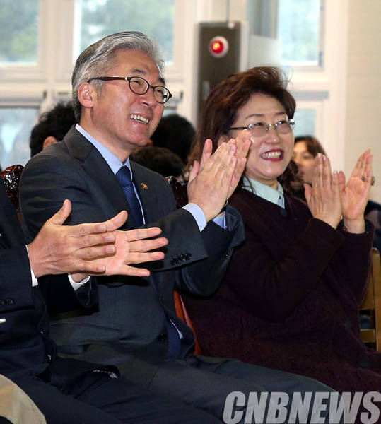 김종덕 문화체육관광부 장관이 16일 설을 맞아, 충북 청주시에 위치한 한 사회복지시설을 방문해 권현숙 원장과 함께 어린이들의 공연을 관람하고 있다.(사진=문화체육관광부)