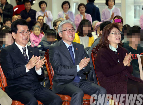 김종덕(사진 중앙) 문화체육관광부 장관이 16일 설을 맞아, 충북 청주시에 위치한 한 사회복지시설을 방문해 이시종(사진 맨 좌측) 충북도지사, 권현숙 원장과 함께 어린이들의 공연을 관람하고 있다.(사진=문화체육관광부)