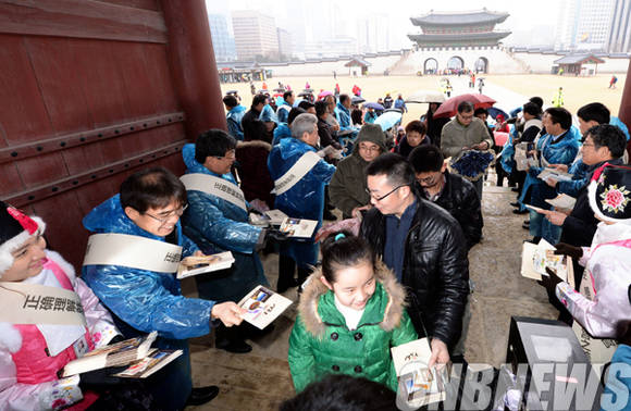 문화체육관광부와 한국관광공사·한국여행업협회·한국관광통역안내사협회 직원들이 16일 서울 경복궁 홍례문 앞에서 중국인 관광객 대상 경복궁리플릿을 배포하고 있다.(사진=문화체육관광부)