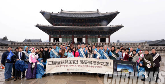 16일 문체부·한국관광공사·한국여행업협회·한국관광통역안내사협회 직원들이 경복궁 리플릿 배포행사를 마치고 중국인 단체관광객과 함께 기념사진을 촬영하고 있다.
