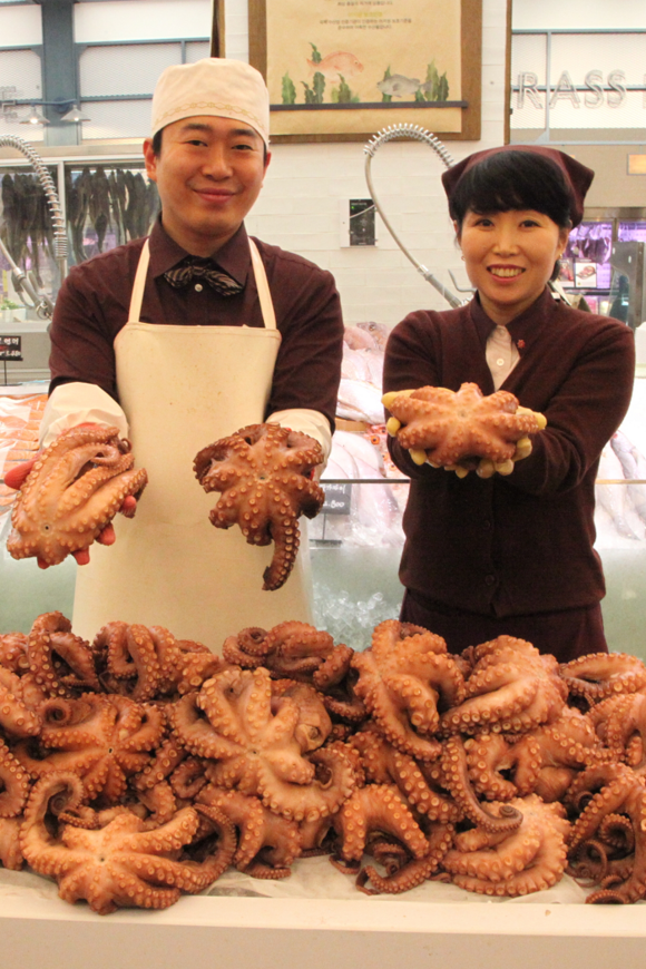신세계 센텀시티 지하1층 푸드마켓에서는 설명절을 맞아 제수용품으로 인기 있는 자숙문어를 판매하고 있다. 이 자숙문어는 국내산으로 고품질 문어를 선별해 이중 세척을 했으며, 전문업체에서 삶아 문어빨판의 청결도가 좋고 익힘이 적당해 살이 부드럽고 향이 강하다. (사진제공=신세계 센텀시티)