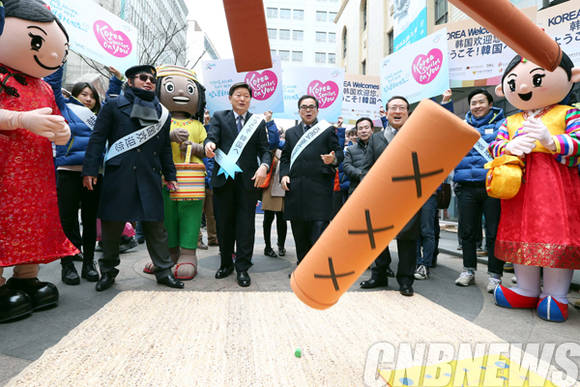 이날 참석한 김종 문화체육관광부 제2차관, 남상만 한국관광협회중앙회 회장, 최창식 중구청장, 명예경찰인 배우 김보성씨가 우리나라 전통놀이인 윷놀이를 함께하고 있다.(사진=문화체육관광부)