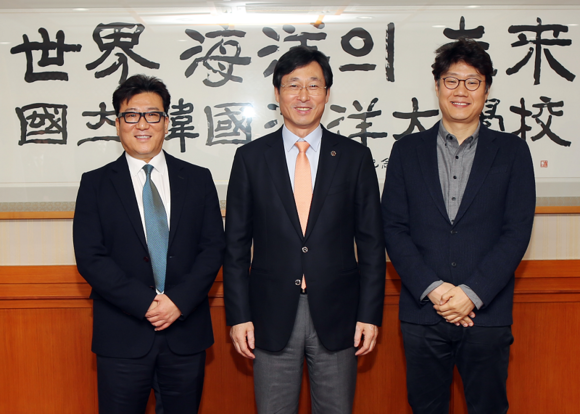 ▲왼쪽부터 윤제균 감독, 박한일 한국해양대 총장, 길영민 JK필름 대표. (사진제공=한국해양대)