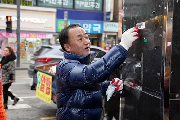 ▲황은성 안성시장이 지난 17일 설 명절을 맞아 청결한 안성 도시을 만들기 위한 일환으로 전개되고 있는 공직자 일제 대청소에 참여해 건물벽에 부착된 불법 광고전단지를 제거하고 있다.(사진=안성시 제공)