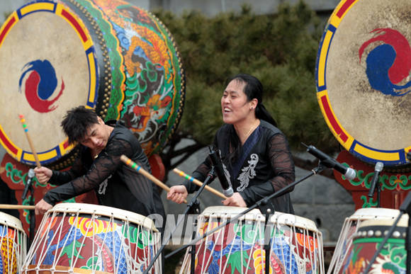 민족최대 명절 설날인 19일 서울 종로구 국립민속박물관에 연휴 나들이를 나선 관람객들이 박물관 앞마당에서 펼쳐진 뿌리패예술단의 'Dance Meets Percussion Arts BEAT' 공연을 관람하고 있다.