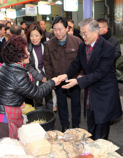 ▲차기 대선후보 지지도에서 새정치민주연합 문재인 대표가 전주 대비 2.3%포인트 오른 27.5%로 7주 연속 선두를 지켜 눈길을끌었다. 설연휴 첫날인 18일 부산시 중구 부평깡통시장을 찾아 상인들과 인사하고 있는 문 대표,(부산= 연합뉴스)