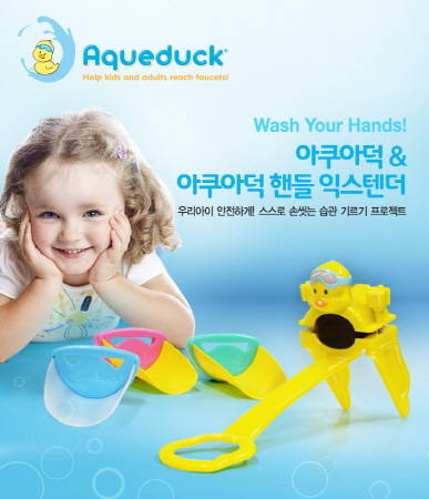 유아용품 브랜드 '아쿠아덕'은 국내 최초로 아이의 수도 손잡이 사용을 용이하게 해주는 ‘아쿠아덕 핸들 익스텐더’를 출시해 주목을 받고 있다, '아쿠아덕'은 처음으로 스스로 손씻기를 시작하는 아이들을 돕기 위해 탄생한 세계적 유아용품 브랜드다.
