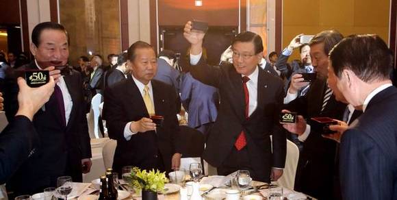 ▲박삼구 금호아시아나 회장은 모태기업인 금호산업을 되찾아 그룹 재도약의 발판으로 삼겠다고 벼르고 있다. 지난 14일 서울 송파구 롯데호텔에서 열린 ‘2015 한일우호 관광교류의 밤’ 행사에서 박삼구 회장(왼쪽에서 세번째)이 니카이 도시히로 일본전국여행업협회 회장 등과 건배를 하고 있다. (사진=연합뉴스)