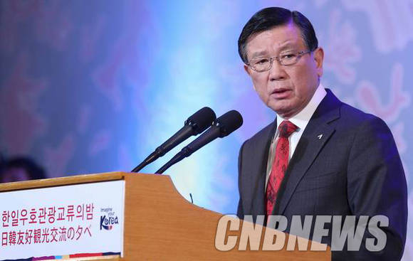 ▲박삼구 금호아시아나그룹 회장이 지난 14일 서울 잠실 롯데호텔에서 열린 ‘한일 국교정상화 50주년 기념 한일 우호 관광 교류의 밤’ 행사에서 축사를 하고 있다. (사진=문화체육관광부제공)
