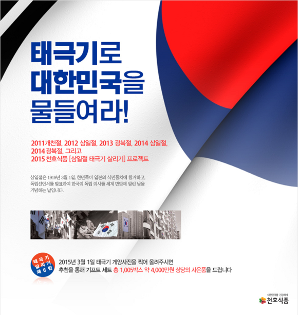 참여 방법은 아파트나 빌라, 주택 단위로 한 팀이 되어 오는 3월 1일 전까지 천호식품 홈페이지(www.chunho.net)에서 사전 신청한 뒤, 3.1절에 태극기를 게양한 사진을 3월 3일까지 올리면 된다.