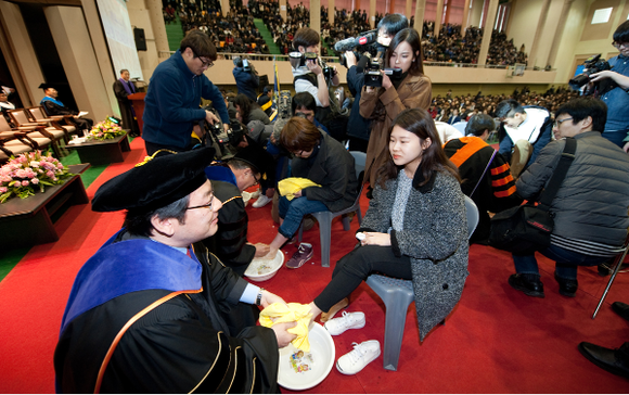 ▲장제국 동서대 총장이 24일 열린 2015학년도 입학식에서 신입생의 발을 직접 씻겨주고 있다. (사진제공=동서대)