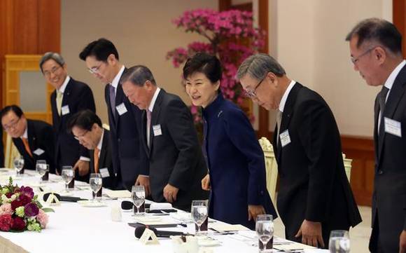 박 대통령은 24일 이재용 삼성전자 부회장, 정의선 현대자동차 부회장, 허동수 GS칼텍스 회장, 구본무 LG그룹 회장, 손길승 SK텔레콤 명예회장, 신동빈 롯데그룹 회장, 조양호 한진그룹 회장, 박삼구 금호아시나그룹 회장, 손경식 CJ그룹 회장, 조현상 효성그룹 부사장, 이해진 네이버 이사회 의장, 김범수 다음카카오 이사회 의장, 황창규 KT 회장, 윤종규 KB금융지주 회장, 신창재 교보생명 회장, 박용현 한국메세나협회 회장 등 재벌그룹 오너와 유수기업 대표 21명을 청와대로 초청해 오찬을 함께 했다.