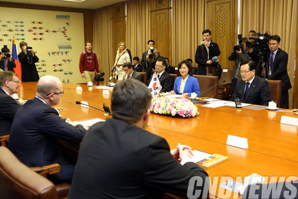 정 의장은 “한&체코 수교 25주년이 되는 뜻 깊은 해에 방한한 것을 환영한다”면서 “프라하의 연인이라는 드라마를 통해 체코는 우리 국민들에게 낭만적이고 아름다운 국가로 잘 알려진 국가”라고 말했다.(사진=국회)