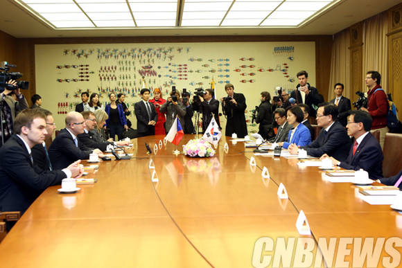 정의화 국회의장은 25일 오후 국회접견실에서 보후슬라프 소보트카(Bohuslav SOBOTKA) 체코 총리와 회담을 갖고, 양국간 협력 관계 증진 방안에 대해 폭넓은 의견을 나눴다.(사진=국회)