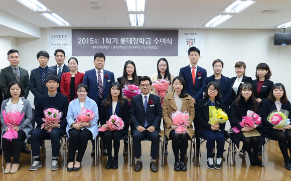 롯데장학재단(이사장 신영자)과 롯데백화점 부산본점(점장 전형식)은 지역거점대학 지원 차원으로 부산대학교 우수학생 11명을 선발해 1학기 전액 장학금을 수여했다. (사진제공=롯데백화점 부산본점)