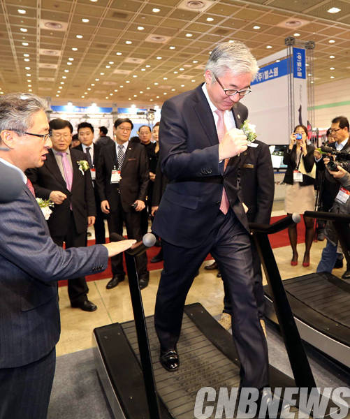 이날 참석한 김종덕 문화체육관광부 장관이 러닝머신을 직접 체험해보고 있다.(사진=문화체육관광부)